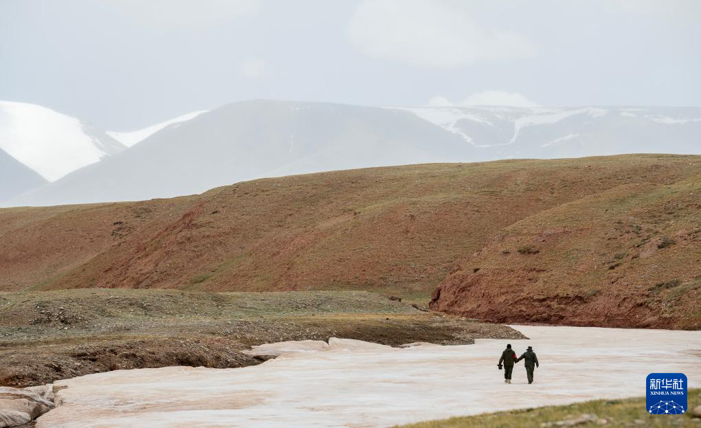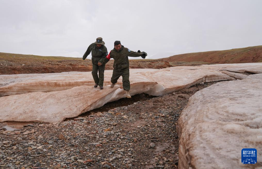 6月15日,羌塘國家級(jí)自然保護(hù)區(qū)野生動(dòng)物專業(yè)管護(hù)隊(duì)員索朗(左)和羅布檢查河面冰凍情況。新華社記者 晉美多吉 攝