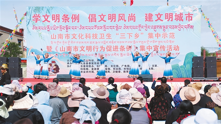 近日,山南市委宣傳部、市文明辦聯(lián)合扎囊縣委宣傳部在扎囊縣阿扎鄉(xiāng)章達(dá)村,開展了以“學(xué)文明條例 倡文明風(fēng)尚 建文明城市”為主題的山南市文化科技衛(wèi)生“三下鄉(xiāng)”集中示范暨《山南市文明行為促進(jìn)條例》集中宣傳活動(dòng)?!D為活動(dòng)現(xiàn)場。記者 汪純 攝