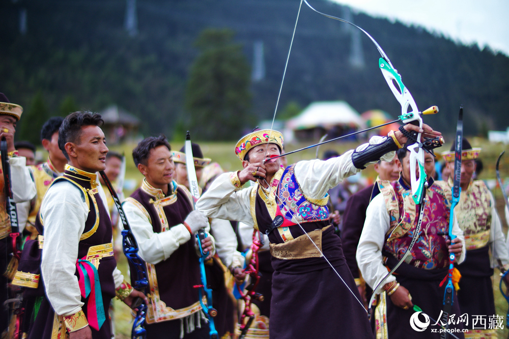 工布牧歌旅游文化節(jié)上,當(dāng)?shù)卮迕裾趨⒓由浼荣?。人民日報記?瓊達(dá)卓嘎攝