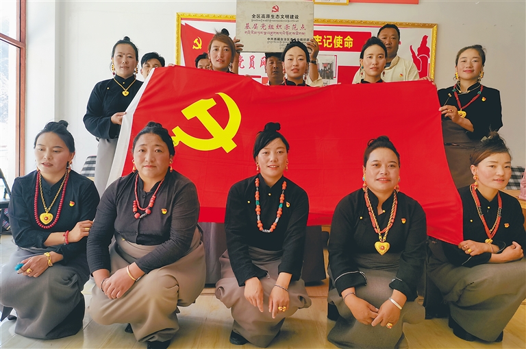 圖為昌都市察雅縣卡貢鄉(xiāng)卡貢村黨員們與黨旗合影。記者 萬(wàn)慧 通訊員 劉林曉 攝