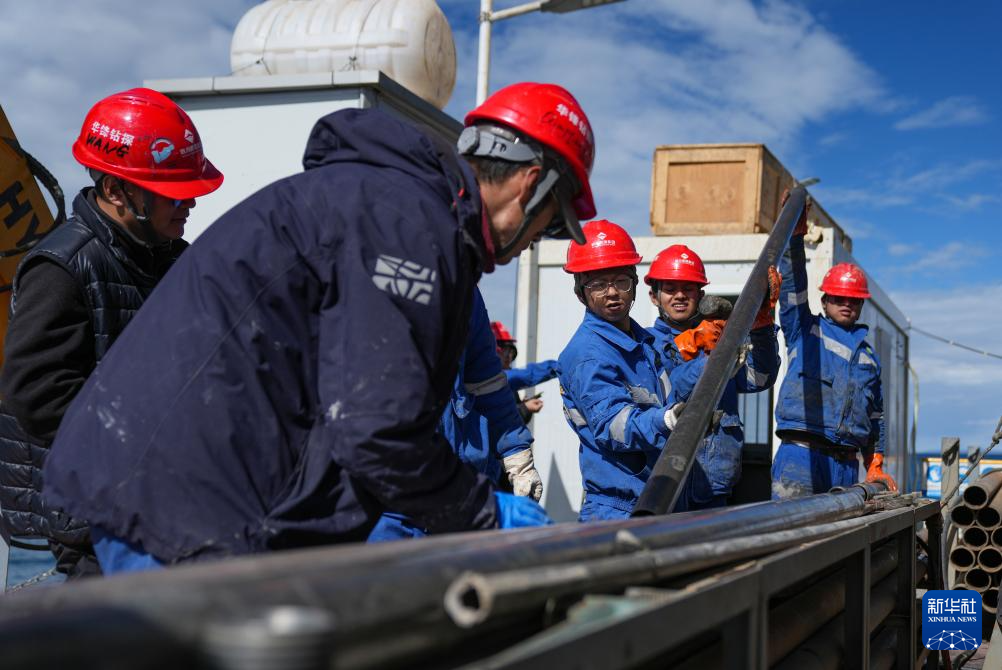 7月11日,鉆探人員提起內管,準備提取湖泊巖芯。新華社記者 晉美多吉 攝