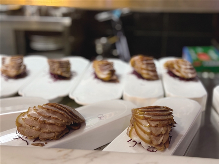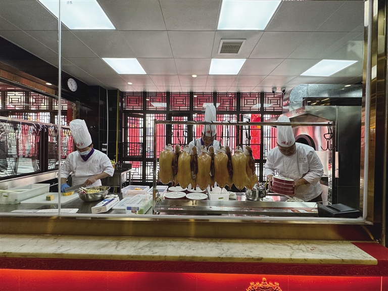 全聚德拉薩店選址于仙足島濱河路二期,店鋪設(shè)計匠心獨運,將古樸典雅的外部風(fēng)貌與簡約優(yōu)雅的現(xiàn)代內(nèi)部裝飾巧妙融合。墻壁上隨處可見的掛畫在介紹著店鋪歷史的同時,更為空間增添了一抹藝術(shù)氣息。開業(yè)當(dāng)天,隨著歡快的開場舞響起,慶典活動正式拉開帷幕?,F(xiàn)場,片鴨師傅們以精湛的技藝展示著全聚德的獨特魅力,一只只色澤誘人的烤鴨在他們的巧手下化身為薄如蟬翼的鴨肉片,搭配新鮮的蔥絲、黃瓜條及特制甜面醬卷入薄餅中,一口咬下,鮮美與香甜在口中瞬間綻放,令人回味無窮。