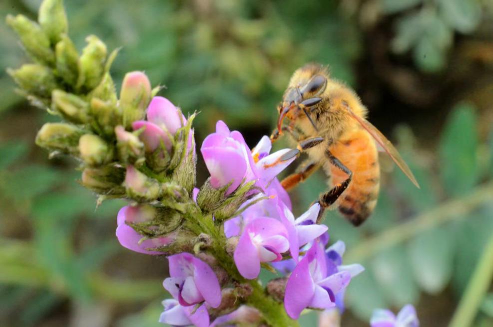 以高原青山為背景板,小蜜蜂們?cè)谖宀世_紛的花叢間上下飛舞,宛如一只只金色的花間精靈。