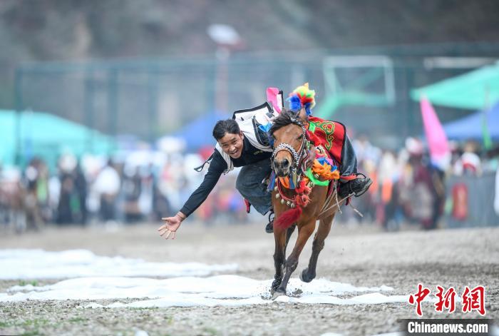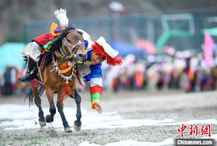 7月21日,西藏自治區(qū)拉薩市堆龍德慶區(qū)馬鎮(zhèn)朗巴村民眾賽馬歡度“望果節(jié)”?!巴?jié)”民俗已有1500多年的歷史,是國家級非物質(zhì)文化遺產(chǎn)。圖為騎手進行馬術表演。中新社記者 貢嘎來松 攝