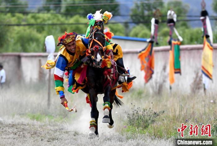 7月27日,西藏拉薩市桑達(dá)村迎來“望果節(jié)”,村民們舉行賽馬活動慶祝?!巴?jié)”是西藏傳統(tǒng)的豐收節(jié),具體日期隨各地莊稼成熟的時間而變化?!巴?jié)”期間,按照習(xí)俗,各地都會舉辦賽馬比賽。圖為騎手進(jìn)行馬術(shù)表演。中新社記者 李林 攝