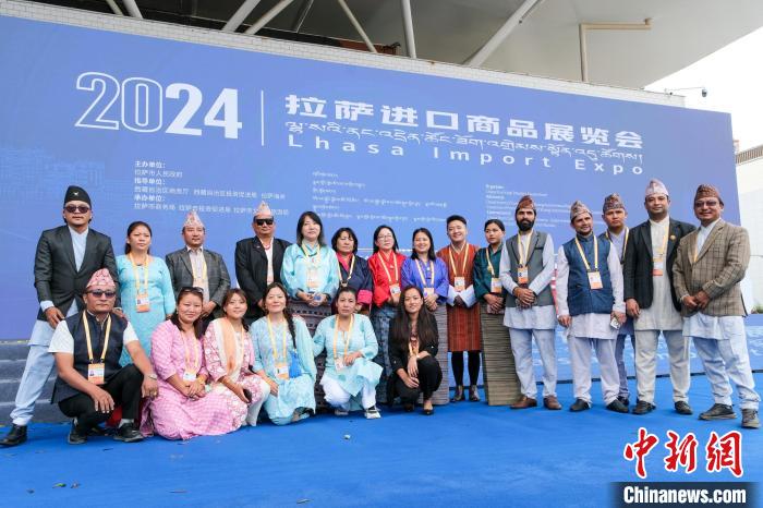 8月4日,來自尼泊爾和不丹的參展商在拉薩進(jìn)口商品展覽會(huì)開幕式現(xiàn)場合影留念。中新社記者 江飛波 攝