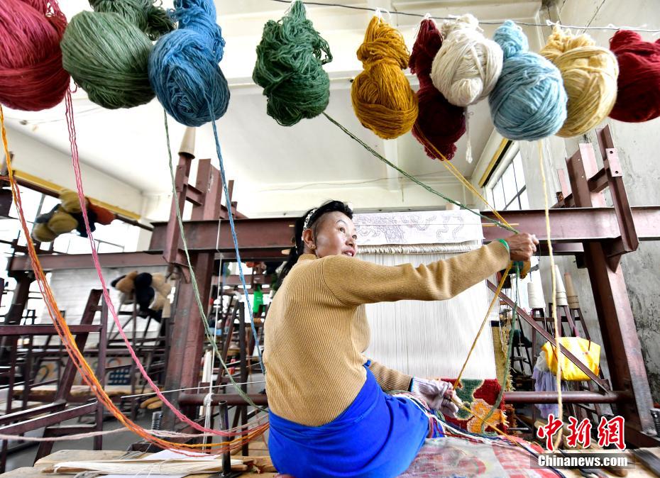 藏毯是世界三大名毯之一,以艷麗的色彩、濃厚的民族風(fēng)格、鮮明的地域特色聞名遐邇。圖為8月16日,西藏拉薩的一家藏毯廠里,巧手的工人們用傳統(tǒng)藏式手工打結(jié)法將五顏六色的羊毛線編織成圖案精美的藏毯。中新社記者 李林 攝