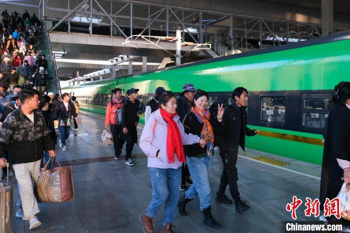 圖為8月16日清晨,乘客在拉薩火車站搭乘C885次列車準(zhǔn)備前往日喀則,當(dāng)日是西藏拉日鐵路通車十周年。中新社記者 江飛波 攝