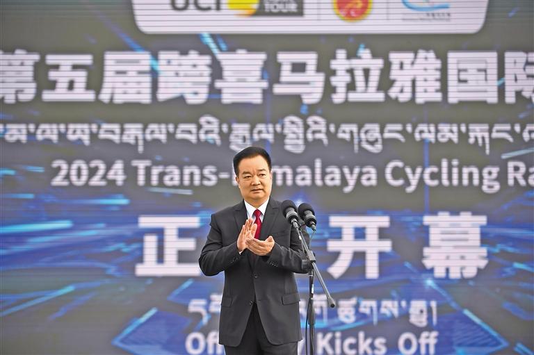 8月21日上午,2024中國西藏第五屆跨喜馬拉雅國際公路自行車極限賽在拉薩市布達(dá)拉宮廣場隆重開幕。這是自治區(qū)黨委書記王君正出席開幕式并宣布本屆比賽開幕。 本報(bào)記者 李洲 攝