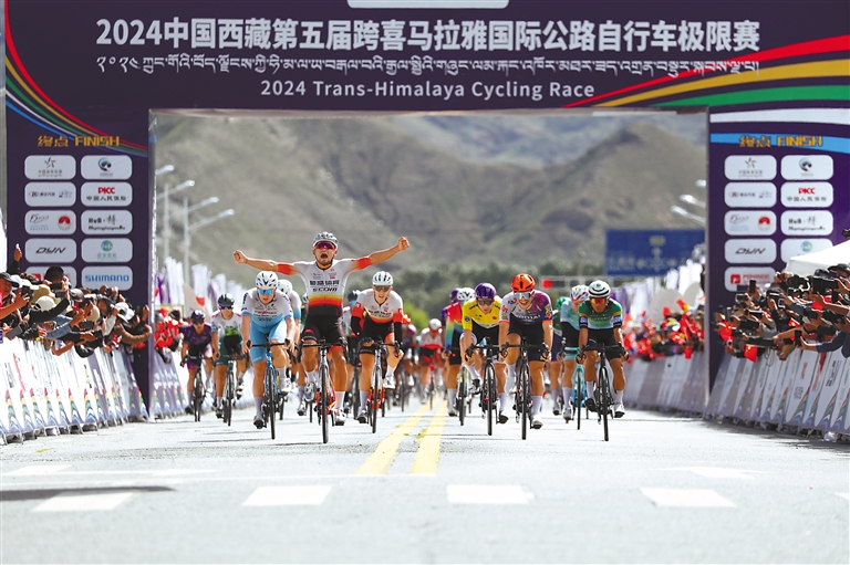 圖為運(yùn)動(dòng)員沖過(guò)日喀則賽段終點(diǎn)線。記者 扎西頓珠 楊子彥 攝