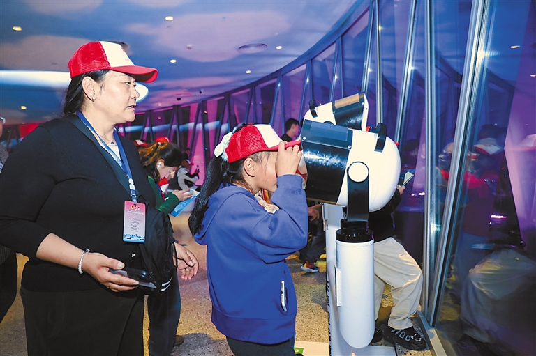 圖為參加冬令營(yíng)研學(xué)交流活動(dòng)的波密少先隊(duì)員在廣州塔用共享望遠(yuǎn)鏡眺望廣州城市夜景。記者 謝筱純 攝