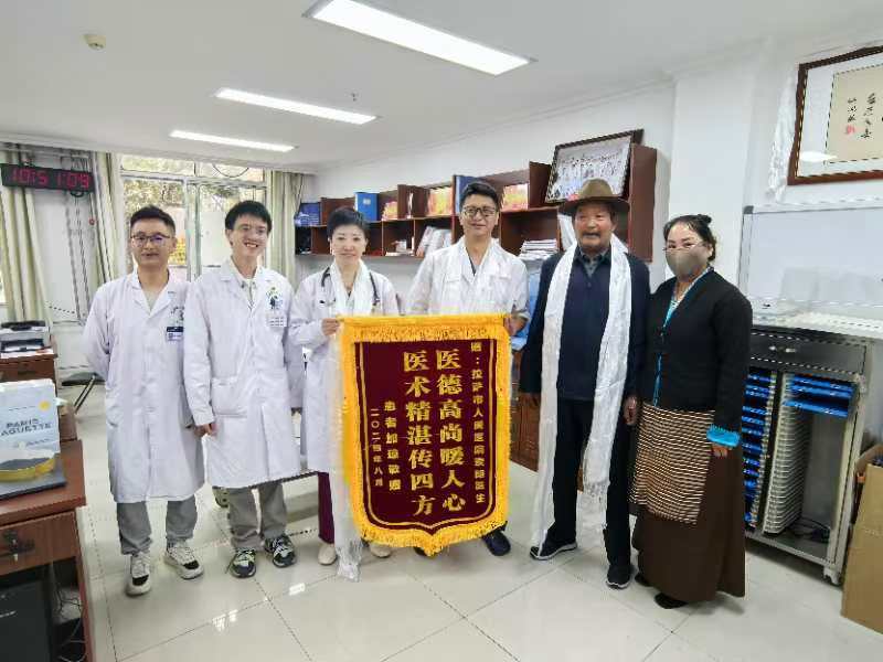 “突切囊,突切囊(非常感謝)?!被颊呒迎偧磳㈦x院之際,特意向主治醫(yī)生索朗和郭麗珠獻(xiàn)上哈達(dá)和錦旗。