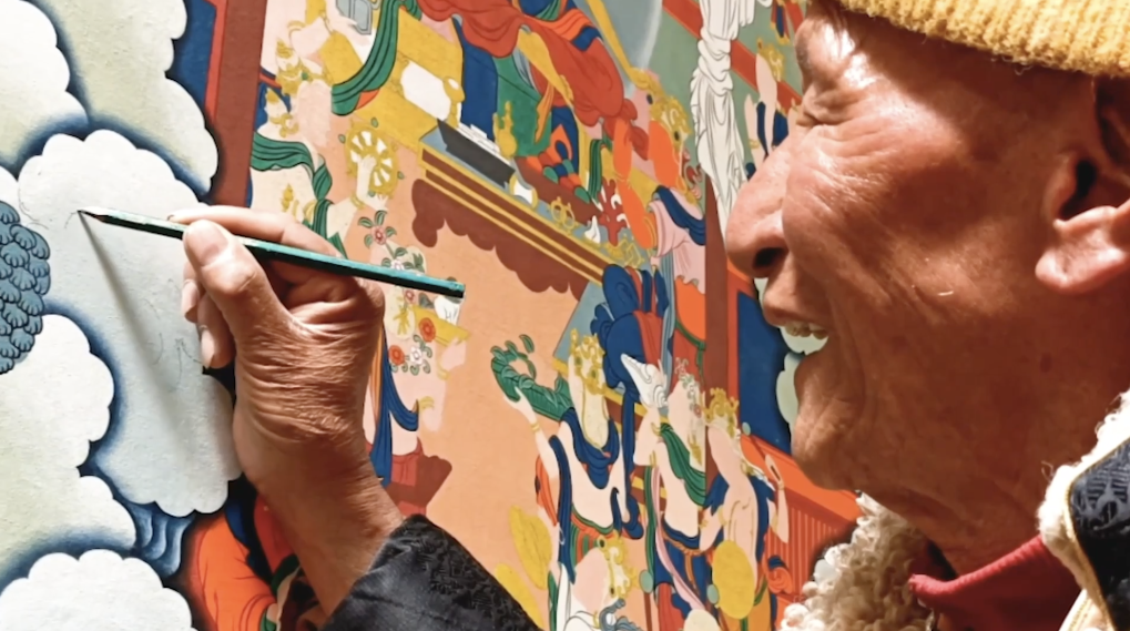 今年92歲高齡的嘎瑪?shù)吕绽先?,是唐卡嘎瑪嘎赤畫派第十代傳承人,曾被西藏自治區(qū)授予“唐卡藝術大師”等稱號。