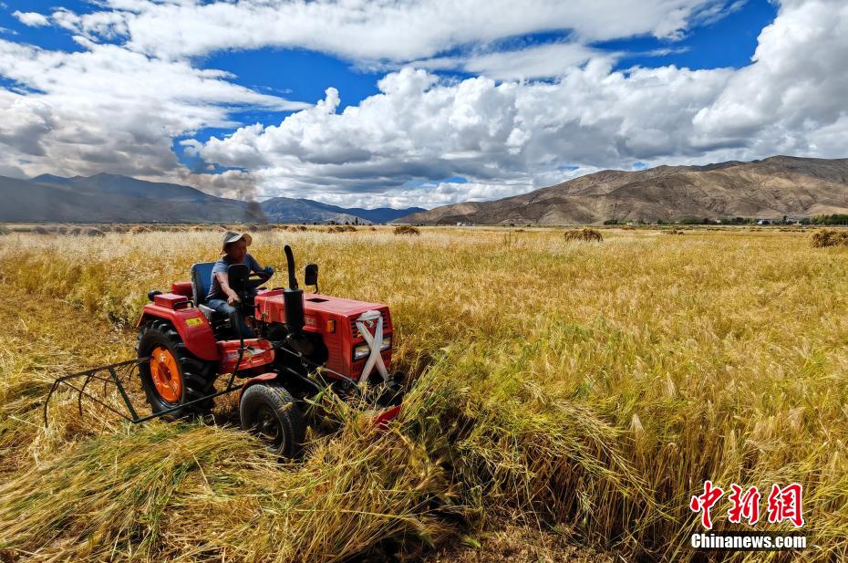 圖為9月14日,日喀則市白朗縣村民駕駛收割機收青稞。中新社記者 李林 攝