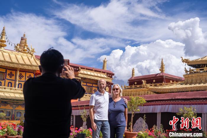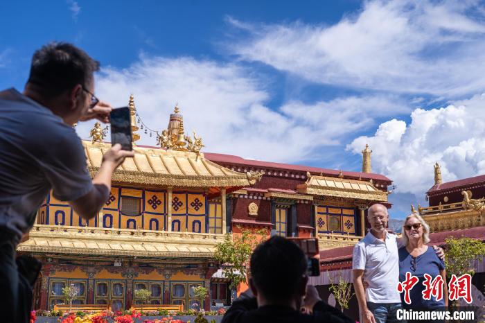 9月17日,外國游客在西藏拉薩大昭寺合影留念。中秋佳節(jié),距今已有1300多年歷史、2000年作為布達拉宮擴展項目列入《世界遺產(chǎn)名錄》的拉薩大昭寺迎來眾多游客。中新社記者 貢嘎來松 攝