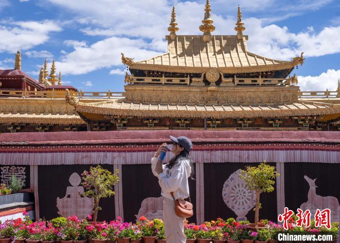 9月17日,游客在西藏拉薩大昭寺金頂前留影。中秋佳節(jié),距今已有1300多年歷史、2000年作為布達拉宮擴展項目列入《世界遺產(chǎn)名錄》的拉薩大昭寺迎來眾多游客。中新社記者 貢嘎來松 攝