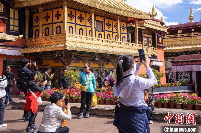 9月17日,游客在西藏拉薩大昭寺拍攝藏服寫真。中秋佳節(jié),距今已有1300多年歷史、2000年作為布達拉宮擴展項目列入《世界遺產(chǎn)名錄》的拉薩大昭寺迎來眾多游客。中新社記者 貢嘎來松 攝