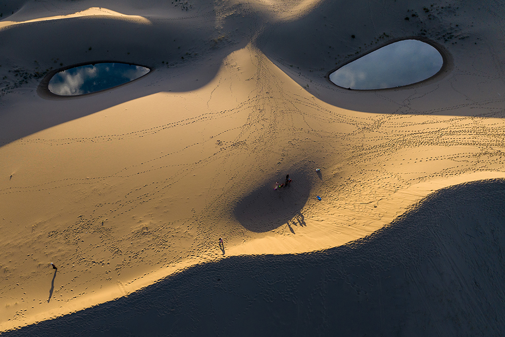 9月15日,游客在西藏山南扎囊國家沙漠公園游玩(無人機照片)。新華網 旦增努布 攝