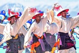 舞蹈演員在納木錯(cuò)開(kāi)湖活動(dòng)現(xiàn)場(chǎng)表演。新華社發(fā)