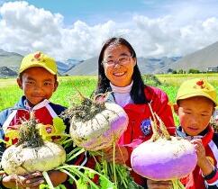在珠峰腳下的田地里,生態(tài)學(xué)專(zhuān)家和學(xué)生們一起展示收獲的蕪菁。新華社發(fā)