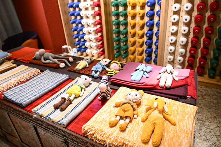 在西藏日喀則市一間門(mén)店拍攝的玩偶、圍巾、披肩等江孜氆氌產(chǎn)品。新華社記者孫瑞博 攝
