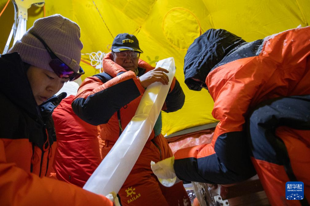 9月11日,在普若崗日冰原,徐柏青(中)在封裝鉆取的冰芯。新華社記者 姜帆 攝