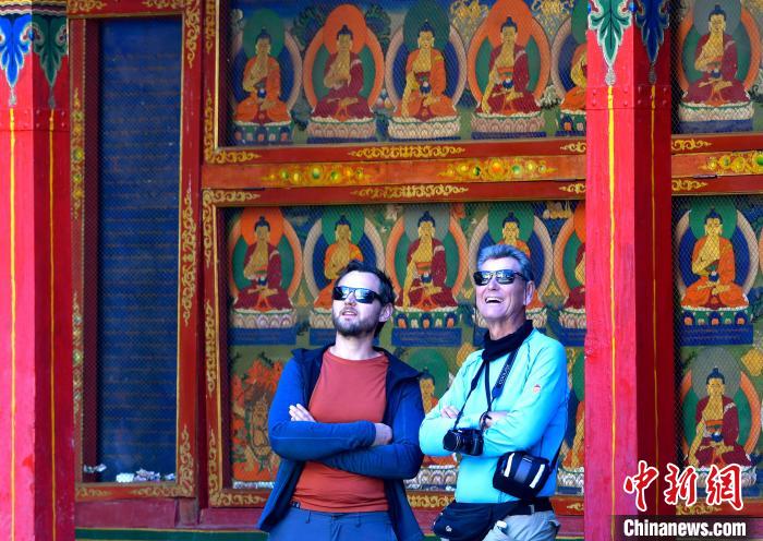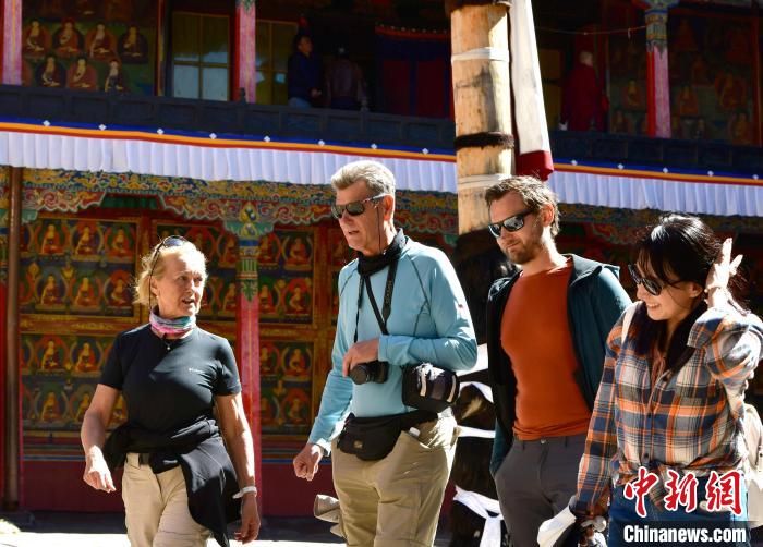10月1日,外國游客在西藏自治區(qū)日喀則市扎什倫布寺內參觀。國慶假期首日,始建于公元1447年的扎什倫布寺成為眾多中外游客的首選。中新社記者 李林 攝
