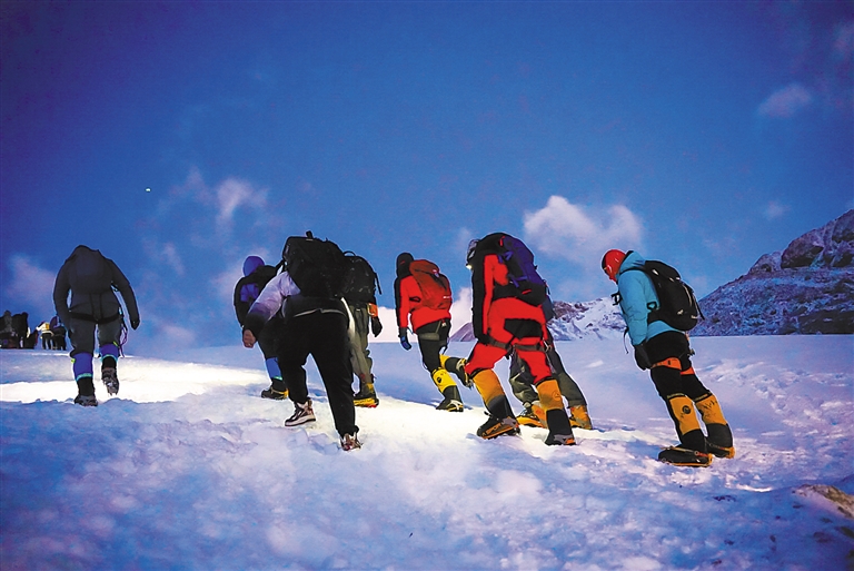 此前,為了讓山友熟悉相關(guān)設(shè)備的使用,自治區(qū)登山隊(duì)的向?qū)円呀?jīng)多次組織、演練設(shè)備使用。功夫不負(fù)有心人,此時(shí)此刻,經(jīng)過認(rèn)真學(xué)習(xí)的山友們正熟練地運(yùn)用著這幾天學(xué)到的技能向著山頂前進(jìn)。隨著海拔的持續(xù)上升,大家只聽到來風(fēng)聲在耳邊呼嘯,頭頂是炫目迷人的陽光。路程過半,山友們的身體和意志正在經(jīng)歷最嚴(yán)峻的考驗(yàn),沉重的大口呼吸聲此起彼伏。
