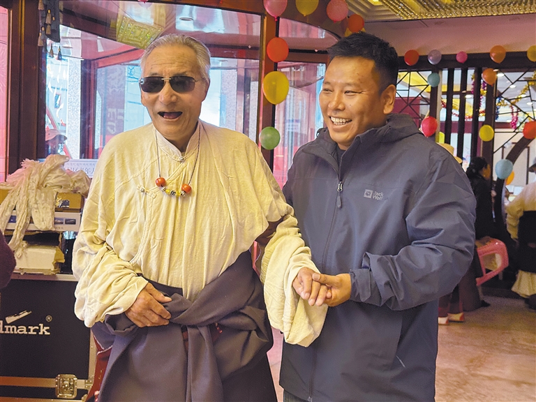 尼瑪是國家級非物質(zhì)文化遺產(chǎn)代表性項目卓舞(瓊結(jié)久河卓舞)國家級代表性傳承人。演出中,他擔任“卓本”(領舞者)角色,協(xié)調(diào)整個團隊11人的舞蹈動作和節(jié)奏?!拔矣H歷西藏翻天覆地的變化,看到如今的盛世,叫我們怎能不歌唱!”面對人們對他不顧年事“執(zhí)著”舞臺的疑問和驚嘆,尼瑪感嘆道。