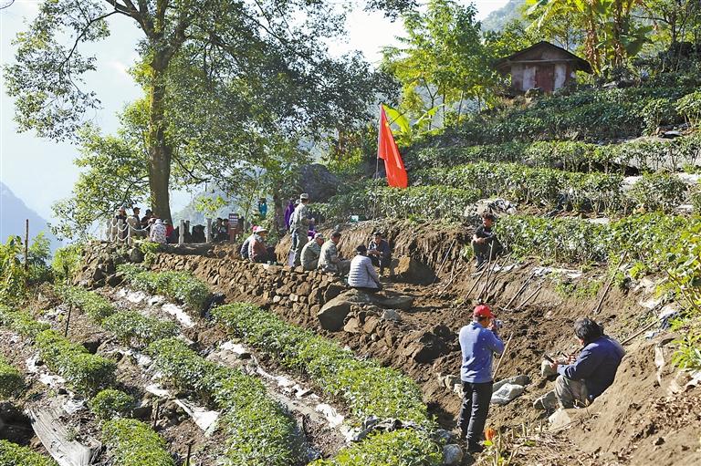 墨脫縣德興村茶果園內(nèi),工作人員正在護理樹苗。 記者王珊 謝筱純 攝