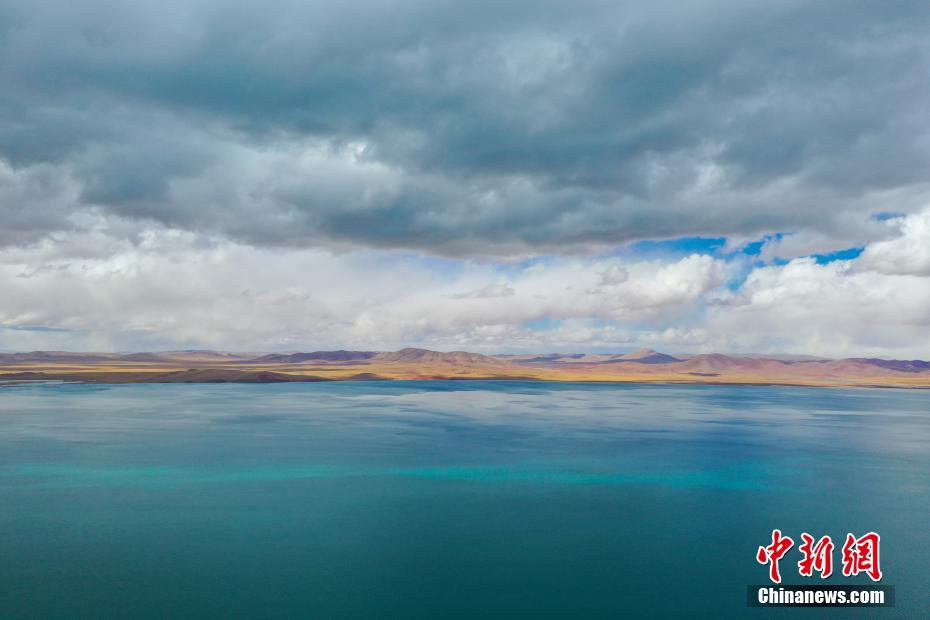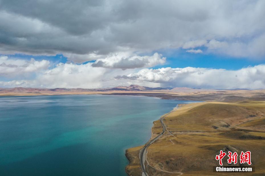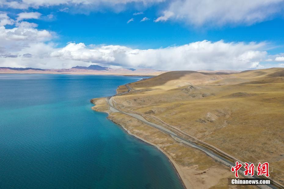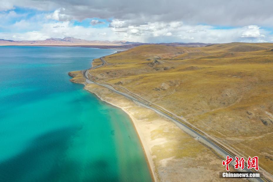 10月24日,鳥(niǎo)瞰深秋時(shí)節(jié)的錯(cuò)那湖,美景如畫(huà)。錯(cuò)那湖位于西藏自治區(qū)那曲市安多縣境內(nèi),是怒江的源頭湖。湖水在陽(yáng)光的照耀下,波光粼粼,湖岸線蜿蜒曲折,與周?chē)纳矫}、鐵路、草原共同描繪出一幅美麗的畫(huà)卷。中新社記者 貢嘎來(lái)松 攝