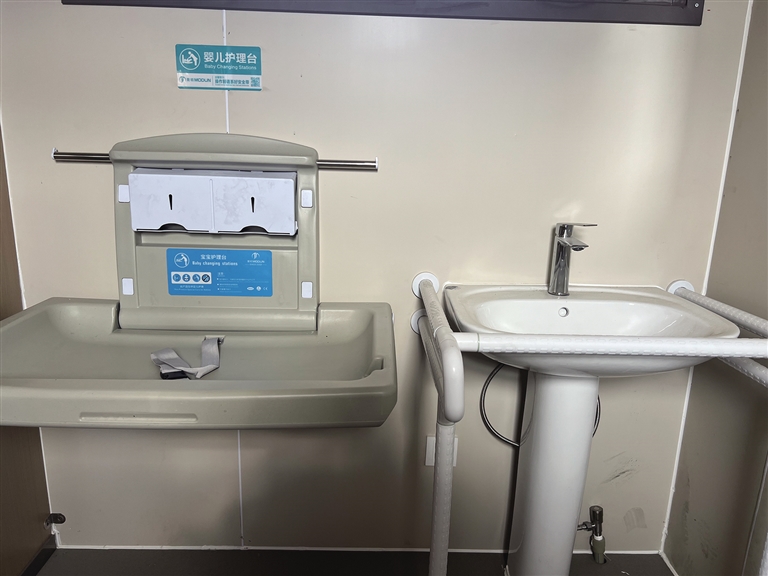 公廁內(nèi)部除了正常的蹲位,還設(shè)有第三衛(wèi)生間。第三衛(wèi)生間內(nèi)配有嬰兒護理臺、嬰兒安全座椅等設(shè)施。除此之外,第三衛(wèi)生間還設(shè)有安全扶手、智能馬桶等設(shè)備,方便腿腳不方便的老年人及殘疾人。智能馬桶旁還安裝有緊急報警器?!叭绻欣先嗽趲?,就可以按一下緊急報警器。這也是我們考慮到殘疾人、老年人如廁不方便,增設(shè)的人性化設(shè)計?!背嗔姓f。