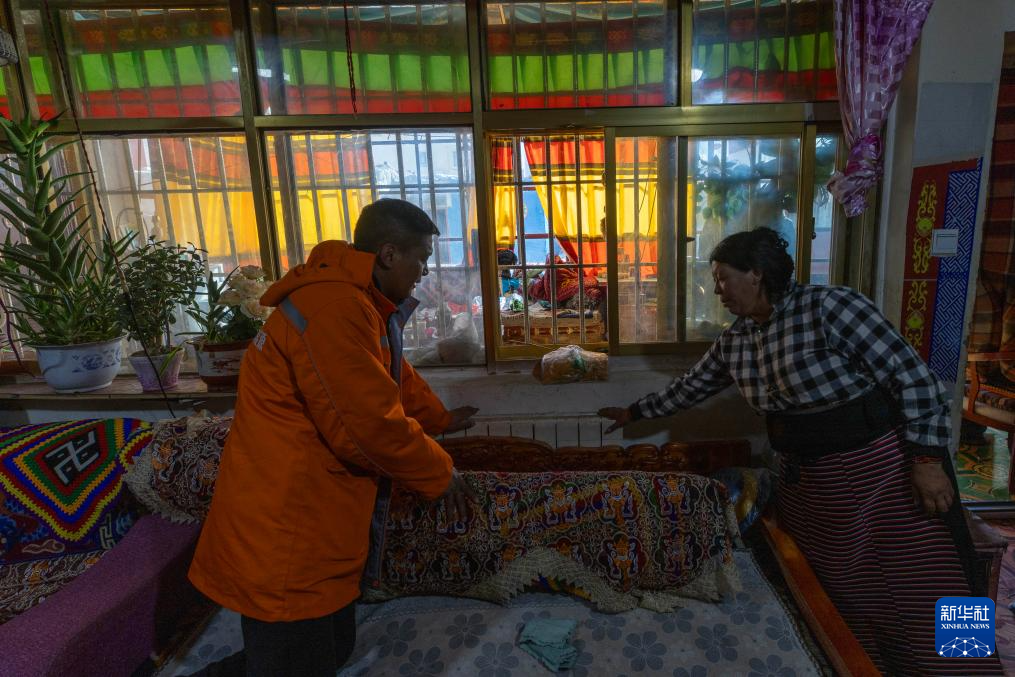 措勤縣城區(qū)清潔能源集中供暖特許經(jīng)營項目工作人員次旺羅布(左)在扎日南木錯社區(qū)居民曲珍家查看供暖情況(11月20日攝)。新華社記者 姜帆 攝