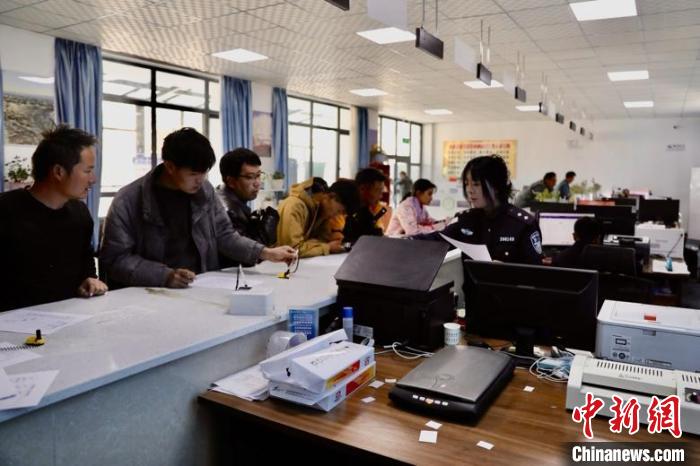 圖為西藏阿里邊境管理支隊(duì)札達(dá)邊境管理大隊(duì)辦證大廳內(nèi),民警正在為民眾辦證。陳孝東 攝