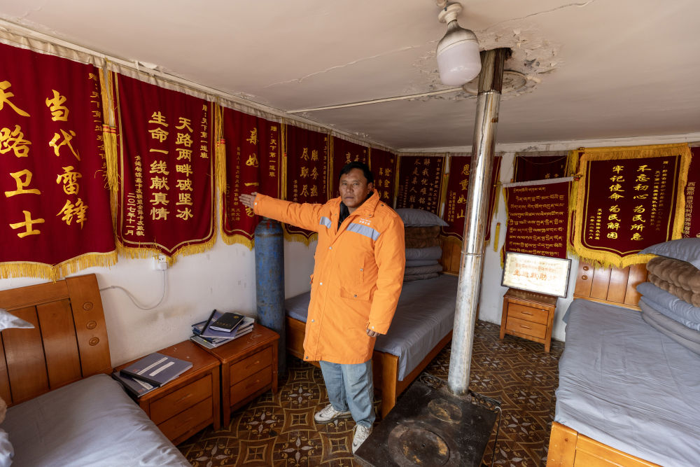 這里的救助站吸引了記者的注意。進(jìn)入房間,內(nèi)有床鋪、氧氣瓶、抗高反藥等物品,四面墻上掛滿錦旗。一封毛筆書寫的紅底感謝信格外顯眼,信中表達(dá)了對地嘎、東力、次仁多吉三名養(yǎng)路工人的感謝。信中寫道:“在那漫長的10個小時里,你們不顧危險(xiǎn)和疲憊,想盡辦法讓我脫險(xiǎn)?!?/p>