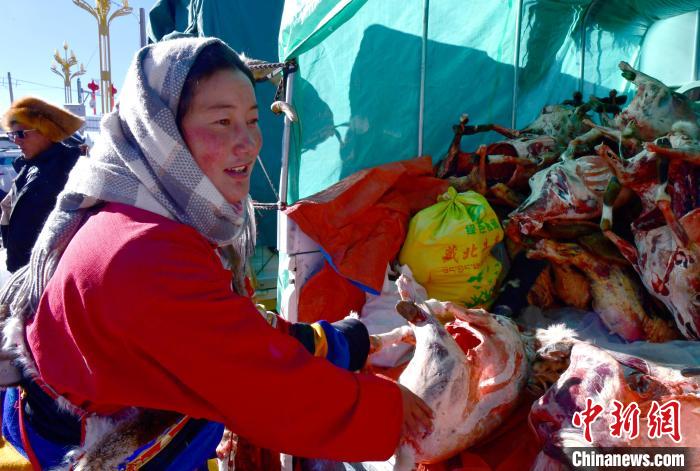12月6日,西藏自治區(qū)那曲市申扎縣第十八屆畜產(chǎn)品展銷會(huì)現(xiàn)場,牧民整理售賣的羊肉?!±盍?攝