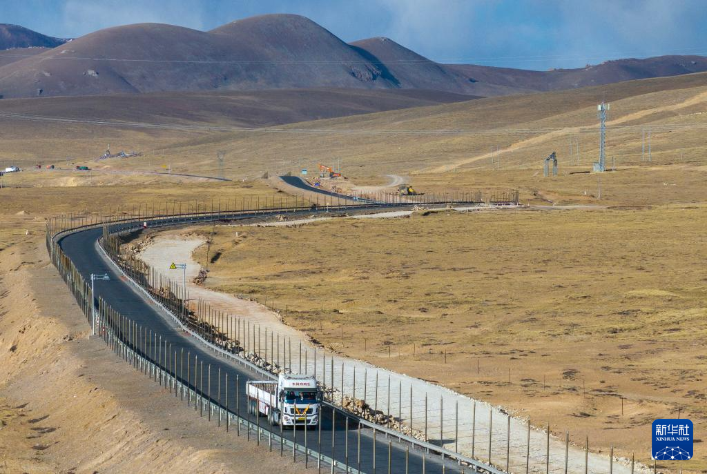 貨車從兩側遍布熱棒的青藏公路一段經過(12月2日攝)。新華社記者 姜帆 攝