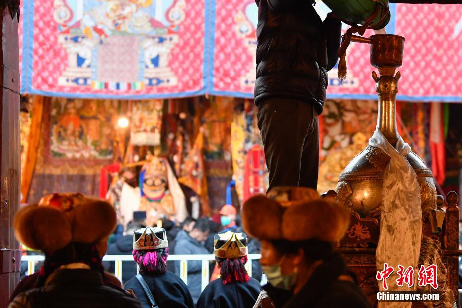 12月15日即藏歷十月十五日是藏族傳統(tǒng)的節(jié)日“白來日追”,俗稱“仙女節(jié)”、“白拉姆節(jié)”等。相傳藏傳佛教最高護法神之一班丹拉姆的女兒白拉姆,不顧母親的反對與赤尊贊私定終身,班丹拉姆一怒之下將赤尊贊趕到拉薩河南岸,規(guī)定二人僅每年的藏歷十月十五日相見。圖為工作人員將青稞酒倒入女神白拉姆像前的酒壇。