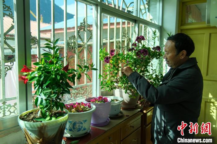 今年62歲的益西四郎是西藏波密縣居民,如今已經退休,他見證了川藏公路波密段幾十年間的變化。圖為12月14日,益西四郎在家打理花草。記者 江飛波 攝