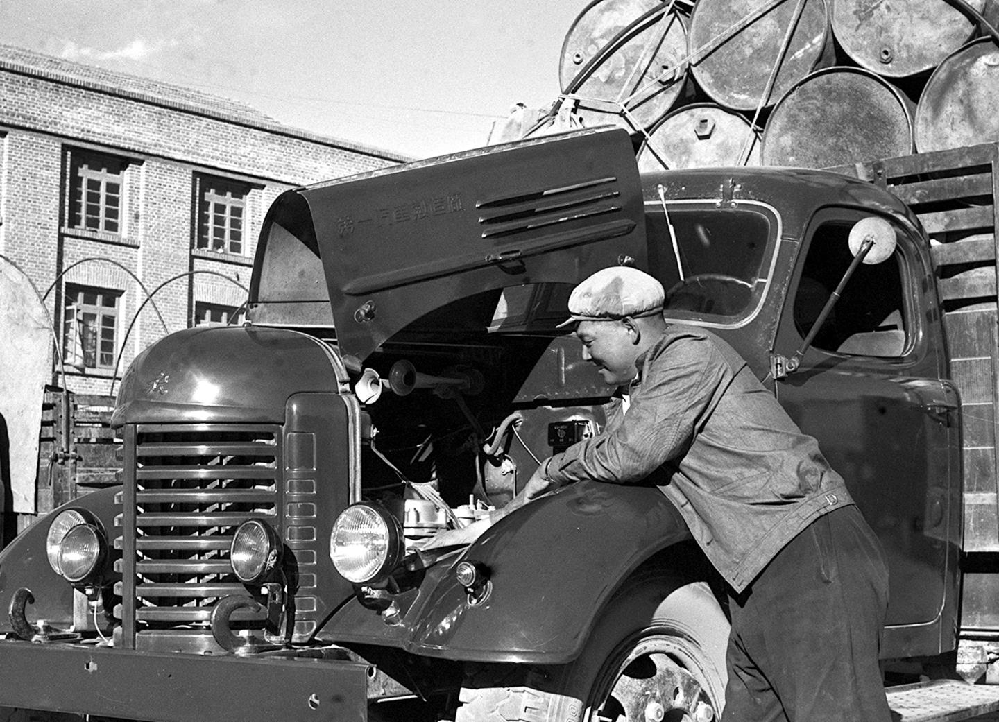 1964年,曾經(jīng)是川藏公路筑路工人的汽車駕駛員呷瑪卻桑在出車前對(duì)汽車機(jī)件進(jìn)行檢查?!?/p>
