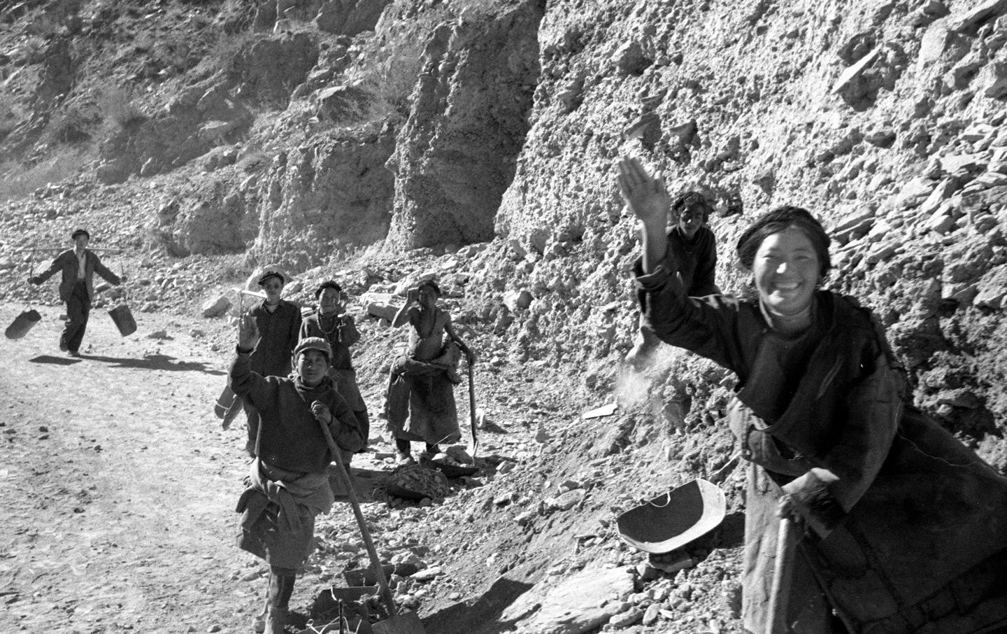 二十世紀(jì)60年代,在川藏公路上,辛勤的藏族養(yǎng)路工人熱情地向過路的旅客們揮手。