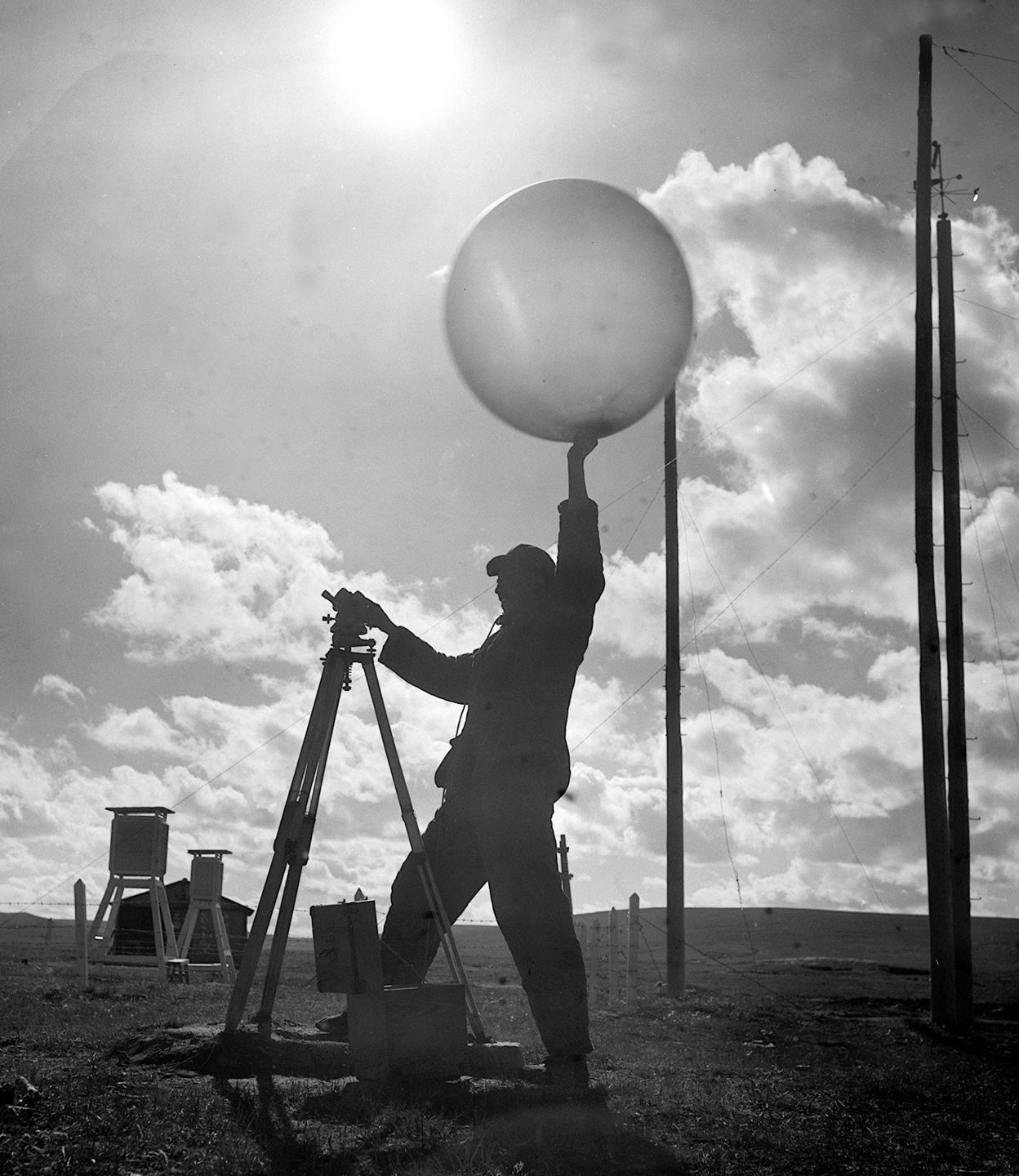1964年,五道梁氣象服務(wù)站的工作人員放測(cè)風(fēng)氣球。在昆侖山里工作的氣象工作者,長(zhǎng)期堅(jiān)守工作崗位,為青藏公路安全運(yùn)輸提供了寶貴的氣象資料。
