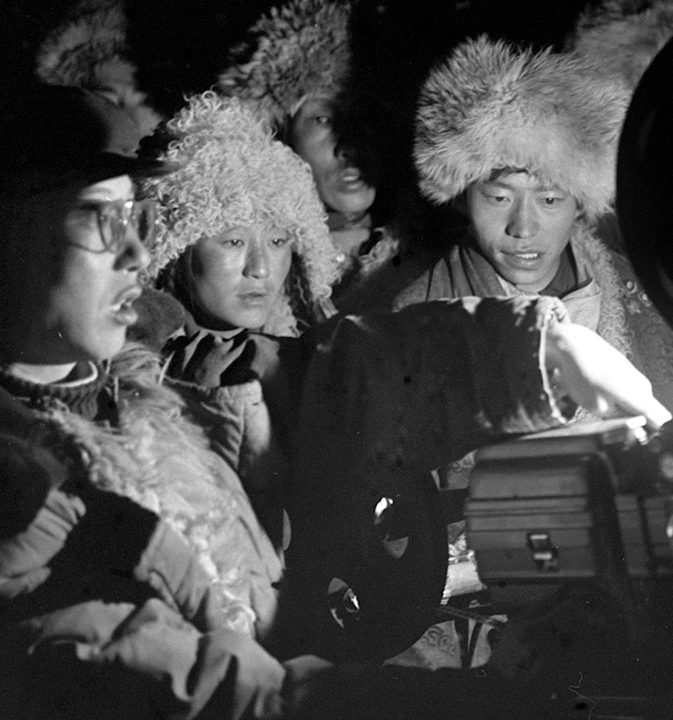 1964年,西藏安多縣的牧民們圍著電影放映機(jī),等待電影開演。川藏、青藏公路通車后,沿路地區(qū)面貌一新,曾經(jīng)荒僻的地方,居民們也能看到電影了。