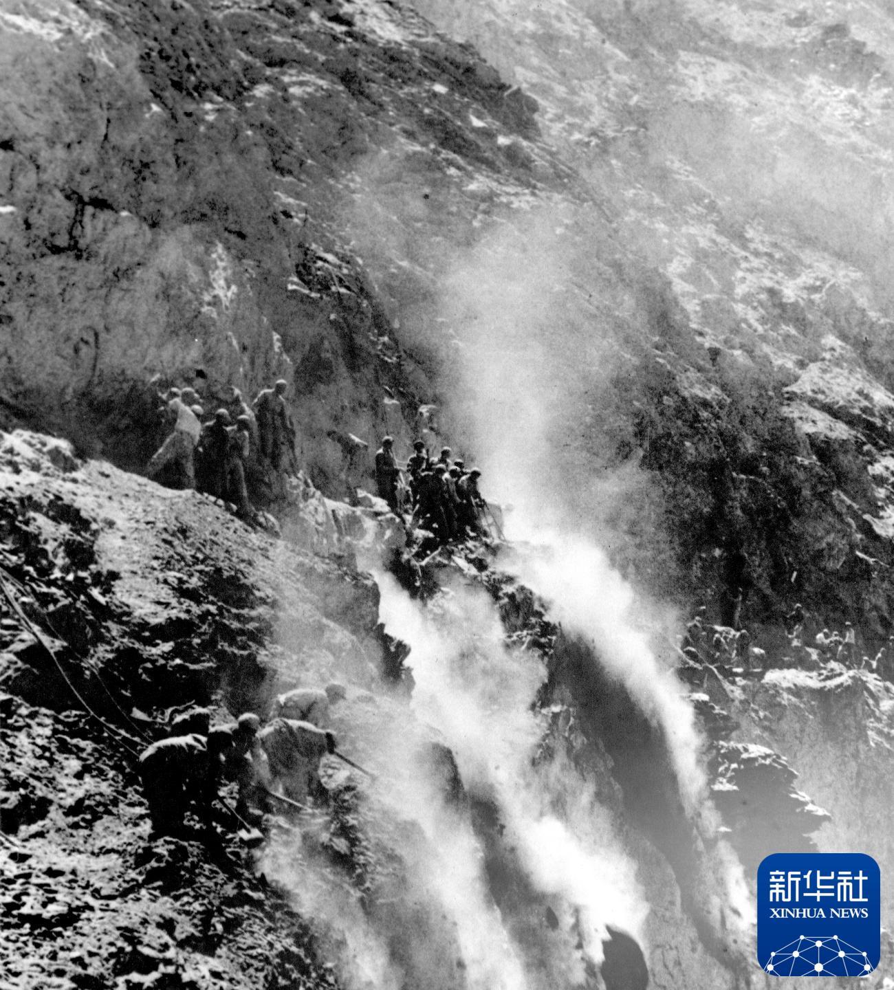 筑路戰(zhàn)士在怒江兩岸的懸崖陡壁上辟山筑路。新華社發(fā)