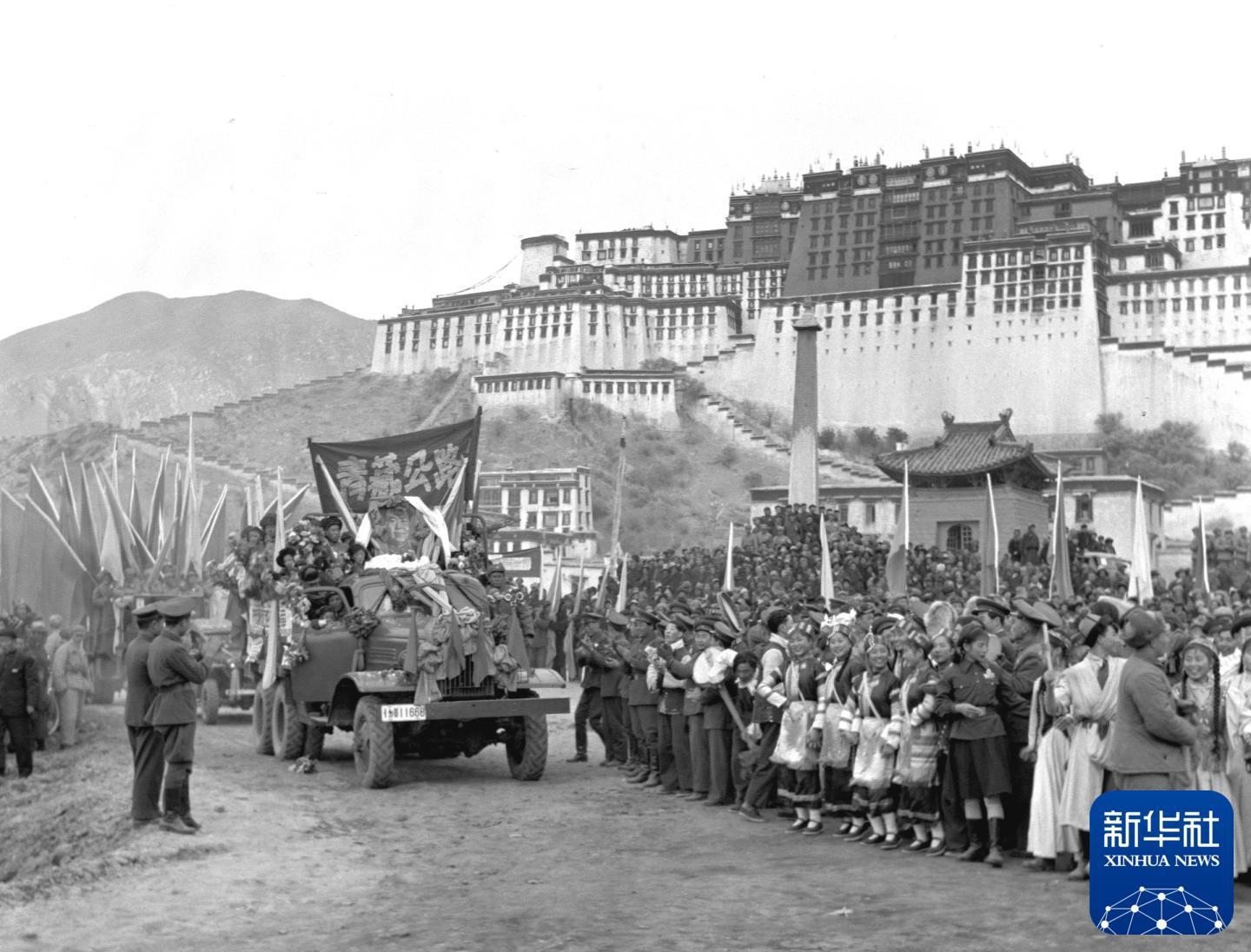 1954年12月25日,川藏公路、青藏公路同時(shí)正式通車。這是通車儀式在西藏拉薩舉行。新華社發(fā)