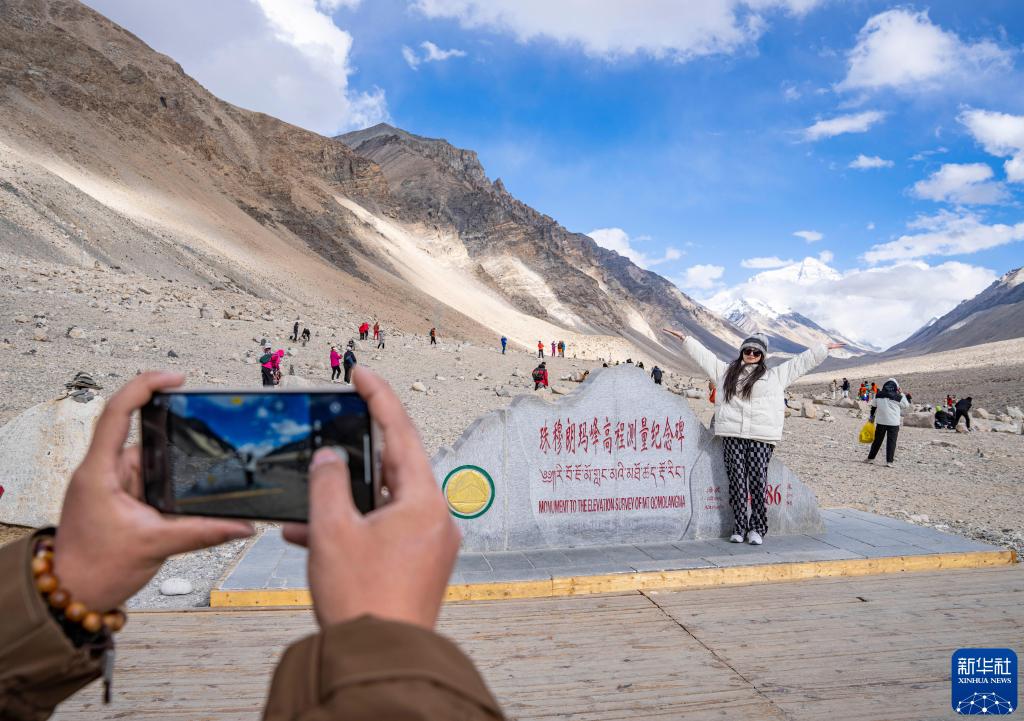 2024年5月24日,游客在珠穆朗瑪峰高程測量紀(jì)念碑前拍照留念。新華社記者 孫非 攝