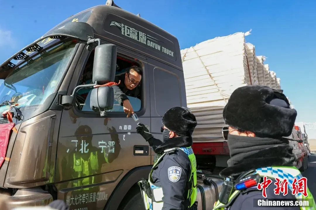 圖為交警為貨車司機測量血氧。中新社記者 貢嘎來松