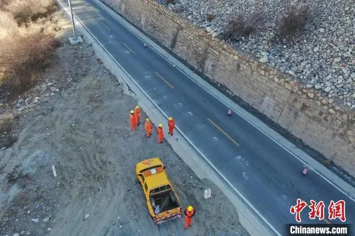 圖為道班工人在公路上巡護。(無人機照片)中新社記者 貢嘎來松 攝
