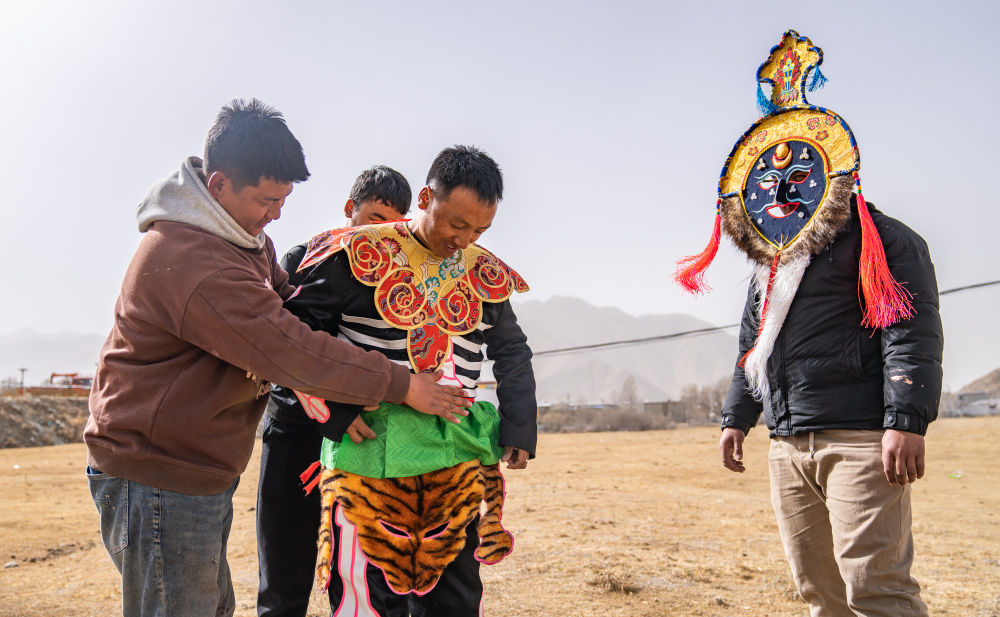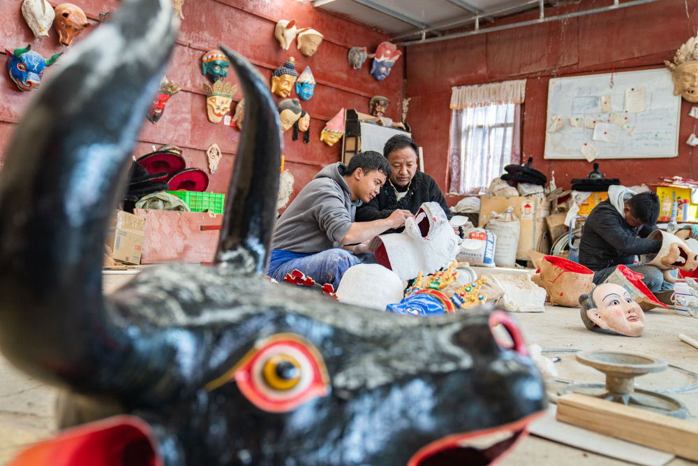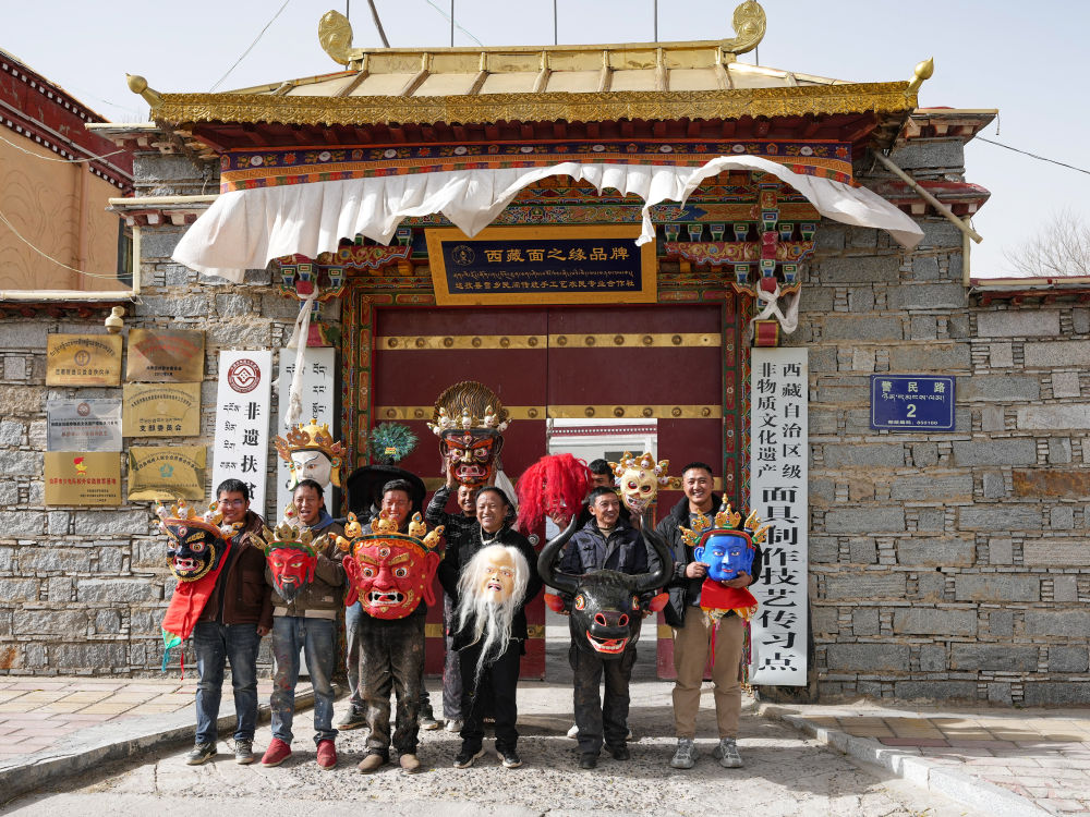 拉薩達孜區(qū)雪鄉(xiāng)民間傳統(tǒng)手工藝農(nóng)民專業(yè)合作社的工匠在合作社門前的空地上佩戴檢查做好的西藏傳統(tǒng)面具。