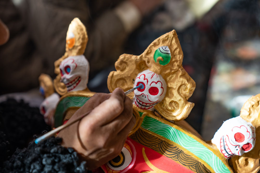 拉薩達孜區(qū)雪鄉(xiāng)民間傳統(tǒng)手工藝農(nóng)民專業(yè)合作社的面具制作工匠制作傳統(tǒng)面具。
